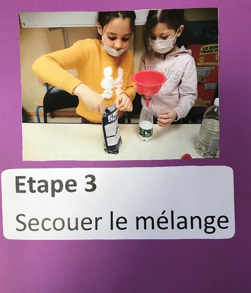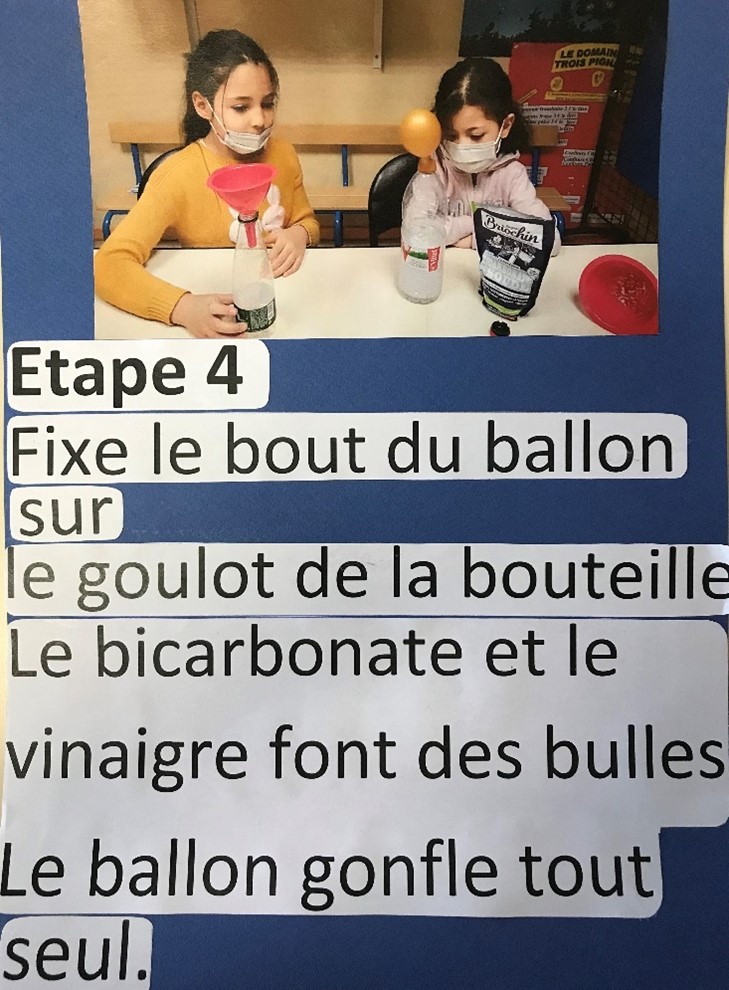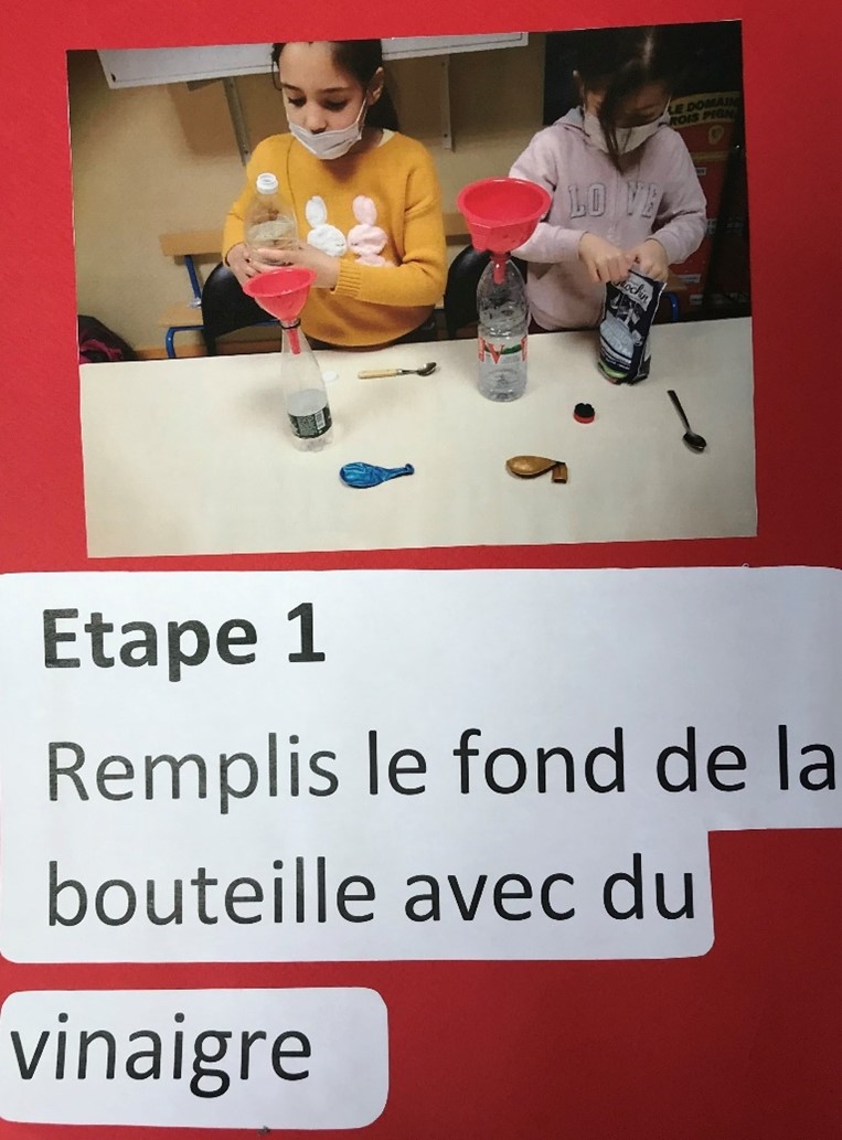 Ni une ni deux, avec l’aide de Brigitte, notre enseignante, et d’une camarade, Nawel commence la réalisation de son expérience : le ballon autogonflant.
